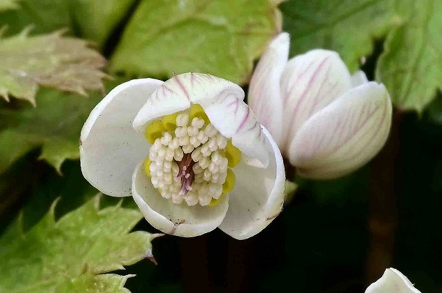 | 名は、花がウメに少し似たオウレンの意。葉がウコギに似ているので別名ゴカヨウオウレン(五加葉黄蓮)という。種小名のquinquefoliaは「5葉の」を表す。オウレンは薬用だが、バイカオウレンは薬用とはされていない。 山地帯~亜高山帯の針葉樹林下や林縁に生える常緑の多年草で、高さ4-15cmになる。日本固有。根茎は黄色で細長く、地中を横にはい、節からひげ根を出す。匐枝を出して殖える。 根生葉は根茎の先に数個つき、長い柄があって越冬する。長さ5-13cm、幅3-5.5cmの鳥足状複葉で5小葉からなる。小葉はほぼ無柄、長さ1-2.5cmの倒卵状くさび形で3浅~中裂し、縁に鋭い鋸歯がある。質は厚く、表面は無毛で光沢があり、裏面は脈が明瞭で脈に沿って短毛がある。 早春に葉の中から褐色を帯びた花茎を出し、先に直径1.2-1.8cmの白色でウメに似た両性花を1個上向きにつける。長さ1.5-5mmの披針形~楕円形の苞が1個ある。花弁状の萼片は5個、長さ6-8mmの倒卵形。花弁は黄色で蜜を分泌し、長さ3-3.5mmで舷部は浅い杯状。雄しべは多数、花糸は3-4mmで無毛、葯は0.7mm。雌しべは6-11個、柄があり輪生する。 袋果は長さ6-9mmの舟形、柄は5-6mmで6-11個が輪状に開出する。側面両側に1本ずつ縦筋がある。花柱は短く1mm以下。種子は楕円形で数個。 屋久島に生えるオオゴカヨウオウレンは似ているが匐枝を出さない。花茎はしばしば分枝して複数個の花をつける。亜高山帯~高山帯に生えるミツバノバイカオウレンは3小葉。ミツバオウレンも3小葉だが、 花期:2-5月 分布:本(福島県以南)・四 撮影: 2023.2.8 神奈川県鎌倉市(植栽) |