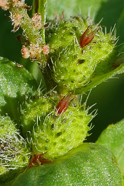 ![]() 花序上部に雄花が穂状につき、基部に総苞に抱かれた雌花がつく。 2019.10.23 神奈川県藤沢市![]() 子房は3室で表面に小さな突起が密にあり、軟毛を密生。 2019.10.23 神奈川県藤沢市 |