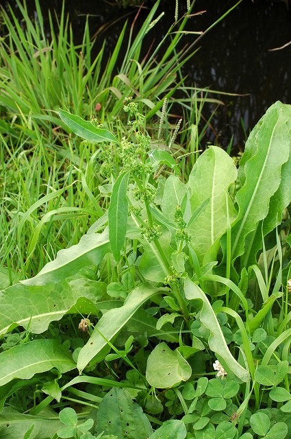 | 名の由来は諸説あるが不明。 田畑のあぜや湿った道端などに生える多年草で、茎は緑色で直立し、上部で分枝して高さ0.4-1mになる。根は黄色~赤橙色で太い。 同属の外来種が数種入り込んでおり、区別が難しいことがある。交雑しやすく、どちらともつかないような個体も多いことがいっそう同定を難しくしている。 葉は緑色で、下部の葉は柄があり、長さ10-25cm、幅4-10cmの長楕円状披針形で先は鈍形、基部は鋭形~やや心形で縁は大きく波打つ。毛はないか裏面脈上に硬い毛がある。上部の葉は無柄。 花は淡緑色で枝先の節々に5-12個が輪生し、全体に狭い円錐花序になる。花被片6個のうち、内側の3個は広卵状心形で縁に低い鋸歯がある。中脈上のこぶ状突起は長卵形で花被片の半ばまで達する。雄しべは6個、花柱は3裂し、柱頭は房状になる。 果柄に関節があり、痩果は3稜形で長さ2.5mm。普通は赤味を帯びない。 帰化種のエゾノギシギシは、翼状花被片の縁に刺状の突起がある。アレチギシギシはこぶ状突起が大きく赤褐色となり、翼状花被片は全縁。スイバは雌雄異株で、葉の基部が矢じり形になる。 花期:5-8月 分布:日本全土 撮影: 2004.8.21 青森県三沢市 |