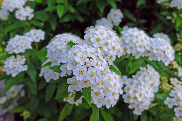 | 名は、半球形の花序を小さな手鞠に見立てたもの。花序が連続してつくので別名スズカケという。古い時代に渡来した中国中部原産の落葉低木で、庭や公園で観賞用に植栽される。コデマリと相対する名前のオオデマリはガマズミ科の落葉低木。 地際から細い幹枝が株立ち状に出て高さ1.5-2mになり、先はしばしば弓なりに垂れ下がる。若枝は稜はなく赤褐色で無毛。樹皮は縦に裂けて落ちる。 葉は互生し、長さ2.5-4cmの菱形状披針形~菱形状長楕円形で基部はくさび形で先はとがる。上半部に欠刻状の鋸歯がある。両面とも無毛、表面はやや青みを帯びた緑色で裏面は粉白色。基部の少し上から左右に側脈が出る。葉柄は長さ2-6mm。托葉はない。 本年枝の先に直径2.5-3cmの半球形の散房花序を枝の上に並んでつける。花は直径0.8-1cmの白色で1花序に20個ほどつける。花柄は長さ0.8-1.2cm。萼筒は無毛、萼片は長さ1.5mmの3角形で5個。花弁は白色で5個、長さ4mmの円形で平開する。雄しべは約20個で花弁より短い。 蜜腺は10個。花柱は長さ1mm。 果実は長さ2mmの袋果で無毛、5個が6-8月に緑褐色に熟して裂開する。種子は多数。 近畿以西に生え栽培もされるイワガサは、葉が卵形~菱形。ユキヤナギは葉が狭披針形で細かい鋸歯がある。花は前年枝の葉腋の散形花序に2-7個つく。花径は約8mm。 花期:4-5月 分布:帰化(園芸)植物 撮影: 2015.4.18 静岡県下田市 |