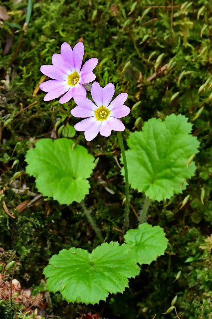 | 名は、イワザクラに似ているが花や葉が小型であることからついたもの。園芸目的の盗掘により随分少なくなった。環境省レッドリスト絶滅危惧Ⅱ類(VU)。 。 深山の岩場に生える日本特産の多年草。細い根茎がある。 葉は数個が根生し、花時に幅1.5-4cmの円形~腎円形で基部は心形、縁は浅く7-9裂し、裂片は先のとがった小裂片に浅く3-5裂する。初め両面、特に裏面に白色のやや縮れた軟毛が密生し、葉が展開するとあまり目立たなくなる。果時には幅5-7cmと大きくなる。葉柄は長さ3-10cmで白色の軟毛が多い。 葉の間から縮れた軟毛がある長さ5-10cmの花茎を直立し、紅紫色~淡紅色の花を散形に1-5個つける。苞は披針形で花茎の先に輪生する。花柄は細長く、小苞はない。萼は筒状で5中裂し、裂片は長さ5-8mmの披針形で先に鈍い硬点がある。花冠喉部は淡橙黄色、高坏形で直径2.5-3cm、筒部は細長く長さ0.8-1cm、上部は5裂して平開し裂片の先は2裂する。雄しべは5個で花糸は短く、花筒に合着する。花に長花柱花と短花柱花の2型がある。 果実は長さ0.7-1.2cmの長楕円形の蒴果で、花後も残る萼と同長か少し長く、先が5裂する。 花が白色のものをシロバナコイワザクラという。 葉が1/3ほどまで裂け、鋸歯が鋭くとがるものをクモイコザクラといい、南アルプス・八ヶ岳・奥秩父などに生える。妙義山に生え、葉がごく浅く裂け、歯牙があまり目立たないものをミョウギコザクラという。武甲山の石灰岩上に生え、葉柄や花茎に暗赤色の毛がやや密に生え、花が大きいものをチチブイワザクラという。 花期:4-5月 分布:本(紀伊半島・中部地方南部・関東地方西南部) 撮影: 2023.4.11 神奈川県箱根町(植栽) |