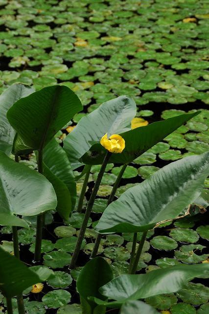 | 水底の泥の中を横にはう根茎が白くて太く、黒っぽい葉柄痕と花柄痕が点在し、それが背骨のように見えるのでこの名がある。 浅い池や沼などに生える多年生の水草で、根茎は太くて白い海綿質で泥中を横にはう。葉痕と花柄痕が目立つ。 葉は根生し、水中に生える沈水葉と水面より高く伸びる抽水葉がある。水位の高いときには水面に浮かび浮水葉状態のときもある。抽水葉は厚くて光沢があり、長さ20-30cm、幅7-12cmの長卵形~長楕円形で全縁、先は鈍頭、基部は矢じり形にへこむ。表面は無毛で裏面は若いときに少し毛がある。葉柄は長く、中実。沈水葉は細長く膜質で、葉縁は波状になる。葉柄は短い。 花柄は円柱形で根生し、水上に抜き出て1個の椀状の花を上向きにつける。花は直径4-5cm、花弁のように黄色く目立つのは萼片で、花後緑色が強くなる。萼片は5個、長さ2.5cmの倒卵形で外面はしばしば緑色を帯びる。本物の花弁は雄しべの変形したもので長さ約8mmの長方形、黄色で多数あるが目立たない。雄しべは多数、花糸は幅広く、葯は内向きにつくが、開花すると雄しべが外に反って曲がり葯が現れる。花糸と葯はほぼ同長。雌しべは独特で上部は円形に広がり、縁は多少反曲して直径6-8mmの柱頭盤となり、柱頭は線状でその上に放射状に並ぶ。 果実は液果状で水中で熟し、崩れて多数の種子を出す。種子に種衣はない。 漢方では川骨(せんこつ)といって、根茎を縦割りにして日干ししたものを婦人病や打撲に用いる。 昔は飢饉のときに根茎を食用にした。 花が橙赤色のものをベニコウホネという。ヒメコウホネは抽水葉は水面に浮いて小さく、長さ6-10cmの広卵形。ネムロコウホネ(エゾコウホネ)は抽水葉は水面に浮き、花は直径約2.5cm、柱頭盤は黄色。ネムロコウホネの柱頭盤が紅色のものをオゼコウホネといい、北海道(空知・宗谷)と本州(群馬県以北)に産する。オゼコウホネの果実が暗紅色のものをウリュウコウホネといい、北海道雨竜沼に産する。 花期:6-9月 分布:北(西部)・本・四・九 撮影: 2003.6.22 青森県木造町 |