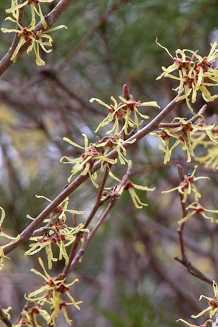 | マンサクに似ていて葉先が円いことからこの名がある。 マンサクの名は、早春に一番初めに「まず咲く」ことからとも、また木にたくさん花をつけることから「満作」とついたともいわれるが、青森県などでは早春に咲く花を全てマンサクとよんでいたことからすると、「満作」説は採用しがたい。 まだ寒いうちから他の花に先駆けて花をつけて春の訪れを告げる木。他の花のない時期に樹冠いっぱいにたくさんの花をつけるので、一つ一つの花は小さくても遠くからでもよく目立つ。花の形は独特で、暗赤紫色の萼片の隙間から4個の黄色い縮れたリボン状の花弁が伸びる。 主に日本海側の山地に生える落葉低木~小高木で高さ2-5mになる。 樹皮は灰褐色で楕円形や線状の皮目がある。 葉は互生し、長さ6-9cm、幅5-8cmの倒卵形~倒卵状円形で葉先は半円形になるかややへこむ。縁の上部に波状の浅い鋸歯があり、基部は左右非相称。革質でややてりがあり、表面の脈はへこみ裏面の脈腋以外は両面無毛。秋には黄葉する。葉柄は長さ1-1.5cm。 早春に葉の展開に先立って、前年枝の葉腋から出た短枝に黄色の花を数個つける。花弁は4個、長さ1-2cmの線形で縮れる。雄しべは4個でごく短く、内側に小さな線形の仮雄しべが4個ある。葯は暗赤色。雌しべの花柱は短く、柱頭は2深裂する。萼片は長さ約3mmの楕円形で4個あり、反り返り、内側は暗赤紫色。 果実は直径1cmほどの卵状球形の蒴果で、萼片が宿存して外側に毛が密生する。熟すと2つに裂開し、長さ7-9mmの球形の黒い種子を2個はじき出す。 捻苧(ねそ)とよばれ、材や樹皮が強靱なので輪かんじきの材料や炭俵の結束に使用された。 花弁が赤いものをアカバナマンサクというが、YListでは別名扱い。花弁の基部のみ赤みを帯びるものはニシキマンサクという。 関東地方以西に分布する基本種のマンサクは、葉の上半部は3角形。葉がないときはマンサクとマルバマンサクとの区別はつかない。 岩手県から関東地方の太平洋側に生えるオオバマンサクは、葉が長さ7-17cmになる。中国地方、四国には葉の両面に星状毛が多く、萼片が黄色いアテツマンサクが分布する。 花期:3-4月 分布:北(西南部)・本(東北地方北部および鳥取県までの日本海側) 撮影: 2003.4.12 青森市 |