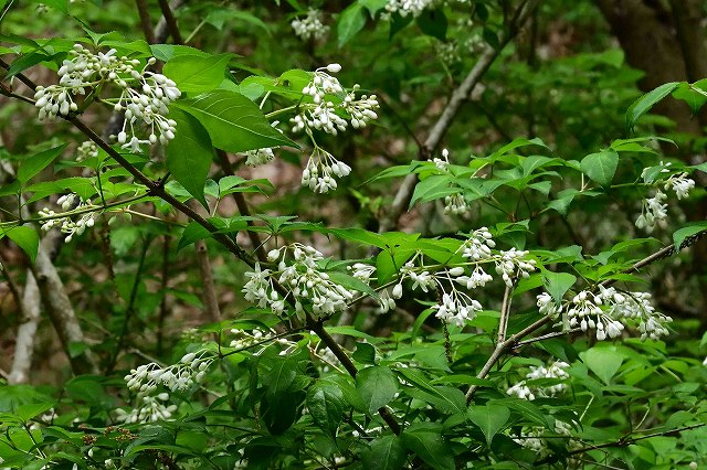 | ウツギのように枝が中空で小葉が3個なのでこの名があるが、ウツギの仲間ではない。樹木で3小葉の葉をもつ木は少なく、タカノツメ、ミツデカエデやメグスリノキなどがある。 丘陵地~山地の日当たりがよくやや湿った林縁に普通に生える落葉低木~小高木で、高さ2-5mになる。樹皮は灰褐色で縦に浅い割れ目が入る。本年枝は褐色で無毛。 葉は対生し3出複葉、葉柄は2.5-7cmで対生する。頂小葉は長さ8-16cm、側小葉は長さ3-7cmの長卵状楕円形~卵形で縁に芒状の細かい鋸歯があり、先は短く伸びて鋭くとがる。頂小葉の基部はくさび形で小葉柄に流れ、側小葉の基部は左右非相称で小葉柄はほぼない。表面と裏面中脈に沿って短毛がある。 枝先に長さ5-8cmの狭い円錐花序を出し、長さ7-8mmの芳香のある白い花を15個ほど垂れ下がるようにつける。萼片と花弁は5個、白色でほぼ同形。花弁は長さ5-7mmで直立して開かない。雄しべは5個で花弁と同長、花糸に毛がある。雌しべは1個で花柱は2裂。 果実は幅2-2.5cmの扁平な矢筈形の蒴果。膜質で横に筋があってやや膨らみ、9-11月に褐色に熟すと先が浅く2-3裂する。種子は長さ4-5mmの倒卵形、淡黄色で光沢がある。 若葉や蕾は山菜として利用する。 材は硬いので、木釘や箸に加工される。 花期:5-6月 分布:北・本・四・九 撮影: 2018.4.19 横浜市緑区 |