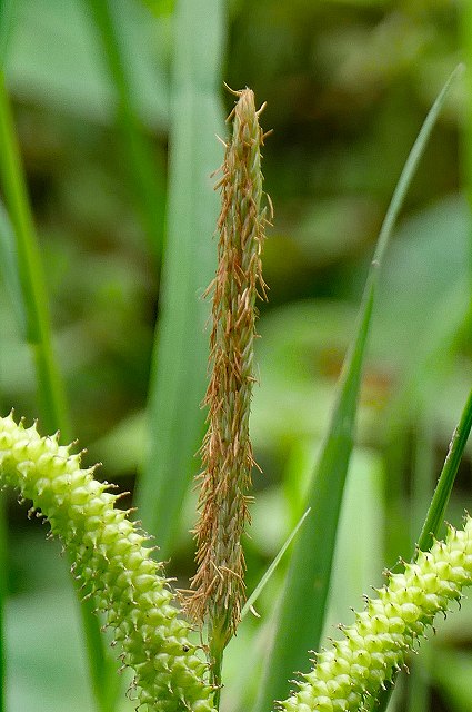 | 名は、シラスゲに似ていて葉裏が白く、より深山に生えると思われたことによる。 丘陵地~低山地の水湿地に生え、細長い根茎があり地下を匐枝が横走して群生するやや大型の多年草。茎はやや太い3稜形で有花茎は高さ50-80cmになる。 茎の中部にも1-2個の葉があり、基部の鞘は淡色。葉は幅0.8-1.5cmの広線形で3脈が目立ち、厚くて軟らかく、下面は著しく粉白を帯びる。 茎の上部に小穂が直立し、頂小穂は雄性で汚黄色、長さ3-8cmの線形で柄がある。側小穂は雌性で2-6個あり、長さ3-6cm、幅7-9mmの円柱形で下方のものには柄があり、多数の果胞を密生してつける。苞は葉と同形の葉状で、茎より長く基部は無鞘。雌鱗片は狭長楕円形で先端は短い芒となり、芒と中肋は緑色で両側は白色。柱頭は3岐。 果胞は膜質で無毛、長さ3.5-4.5mmの広倒卵形で細脈がある。熟すと水平に開出して暗色になり、著しく膨らみ上部は急に短い嘴となって外側に反る。果胞は乾くと黒褐色になる。果実は長さ2mmの倒卵形で3稜がある。 カサスゲは葉の下面は粉白を帯びず、基部の鞘は赤褐色。果胞は熟しても膨らまない。 花期:5-6月 分布:北・本・四・九 撮影: 2019.5.9 川崎市多摩区 |