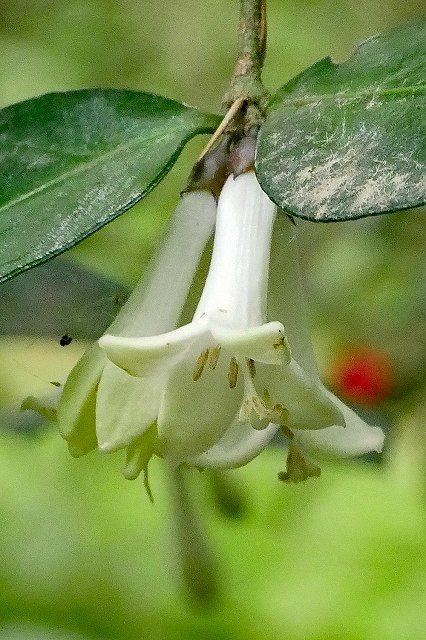 | 葉がアリドオシより大きいことからこの名がある。アリドオシの名は、鋭い刺がアリをも刺し通すほどというたとえ。近畿地方以西に生えるジュズネノキに似ていて、根が数珠状に膨らまないので別名ニセジュズネノキ(偽数珠根の木)という。なお、アリドオシはセンリョウ、マンリョウとともに植えたり正月飾りにして、「千両万両有り通し」と縁起を担ぐ俗信がある。 沿海地~山地の常緑樹林内に生える常緑小低木で、高さ30-70cmになる。根はよく枝を分け、数珠状に膨らまない。枝は灰白色で二叉に分枝して横に広がり、新枝から2-3年枝までは曲がった毛がある。枝に短枝が変化した長さ0.3-1cm、ふつう5-6mmの鋭い刺があるが、大型の葉の半長以下と短い。 葉は対生し、長さ2-6cm、幅0.6-2cmの卵形~卵円形で全縁、先は短くとがり基部は円形~広いくさび形。革質で光沢があり、裏面中脈上に僅かに毛があるほかは無毛。葉柄は長さ1.5-2mm。托葉は長さ1mmの3角形で早落性。 葉腋に白い花がふつう2個ずつつく。萼は長さ3mmの鐘形で4裂し、裂片は長さ1mmで鋭くとがる。花冠は長さ1-1.5cmの筒状漏斗形で先端は4裂し、裂片は長さ約3mmで鈍頭、外面は無毛で内面中部以上に長軟毛が生える。雄しべは4個、花糸は無毛で筒部と同長。子房は下位、4室。花柱は糸状で雄しべより長く、柱頭は4裂し裂片は長さ約2mm。 果実は直径7-8mmの球形の核果で、実付きはあまりよくないが、冬に赤熟し、先端にとがった萼裂片が残る。翌年の花時まで落ちずについているものもある。核は長さ3-4mmの扁平な円形。 アリドオシは刺が長く、大型の葉の半長以上でしばしば同長以上ある。 花期:4-5月 分布:本(関東地方以西)・四・九・沖 撮影: 2017.5.12 神奈川県逗子市 |