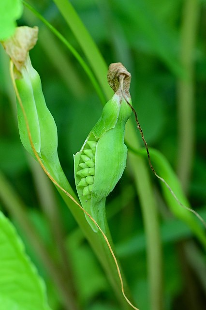 ![]() カラスビシャクとそっくり。 2019.7.5 川崎市宮前区![]() 受粉すると果実が膨らんで仏炎苞の下部が開く。 2022.6.10 横浜市南区![]() 葉は単葉で3深裂し、縁は波打つ。 2019.7.5 川崎市宮前区 |