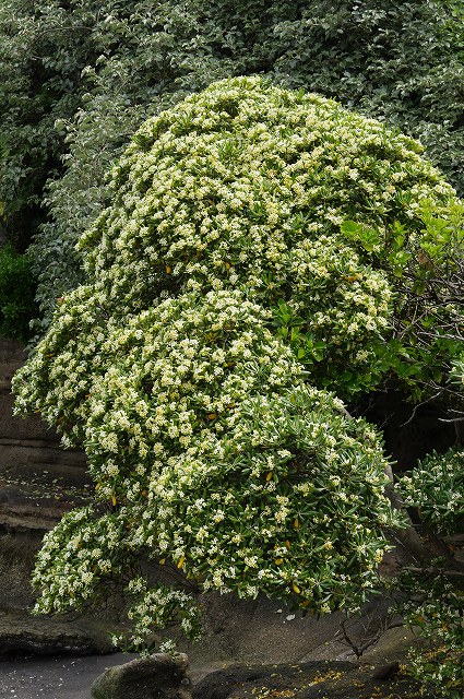 | 名は、枝葉に悪臭があるため、節分や除夜にこの木の枝を扉に挟んで鬼除けに用い、これをトビラノキとよんだものが転訛してトベラになったという。別名トビラノキ。「海桐花」を当てるのは誤用。 海岸に生える雌雄異株の常緑低木~小高木で、下部からよく分枝して茂り、高さ1-5mになる。大きいものは8mにもなる。樹皮は灰褐色で平滑、小さな円形や楕円形の皮目がある。若枝は淡緑色で微軟毛が多い。 公園樹や庭木、防風林としても植栽される。神奈川県の三浦半島では日当りのよい山地稜線でもよく見られるが、鳥によって種子が被食散布されたものだろう。 葉は強い光沢がある革質で、枝先に輪生状に集まって互生する。長さ5-10cm、幅2-3cmの倒卵形~長倒卵形、基部はくさび形で葉柄に流れ先は円い。全縁で日なたの葉は裏側に巻き込む。表面は深緑色で白っぽい主脈がよく目立ち、裏面は淡緑色で脈が隆起する。若葉は両面に微軟毛があるが後に無毛となる。葉柄は長さ0.5-1cm。 本年枝の先に集散花序を出し、花序には微軟毛が密生し、苞は長さ2mmの卵形。花柄は長さ0.7-1.3cm。芳香のある直径2cmほどの白色の花が多数上向きにつく。花は後に黄白色に変わる。萼片は5個あり長さ3mmの卵形で鋭頭、微軟毛が密生する。花弁は5個、長さ1cmのへら形で上部は開出し円頭で縁に微毛がり下部は筒状。雄花の雄しべは5個で花糸は長さ7mmで無毛、葯は長さ2.5mm。雌しべは1個あり長さ7mmで不稔。雌花は雌しべ1個で花柱は1個、長さ2mm、雄しべは5個、花糸は短く葯は小さい。萼片は5個で長さ3mmの卵形。 果実は直径1-1.5cmの球形の蒴果で先に宿存した花柱がある。初冬に黄熟して3片に胞背裂開し、長さ6-7mmで腎形の粘る赤い種子を10-30個出す。粘るので裂開しても落ちず、種子にも臭気があって鳥が好んで食べる。 小笠原には近縁のシロトベラ、オオミノトベラ、コバトベラ、ハハジマトベラが生える。 花期:4-6月 分布:本(岩手・新潟県以南)・四・九・沖 撮影: 2018.5.16 千葉県鴨川市 |
