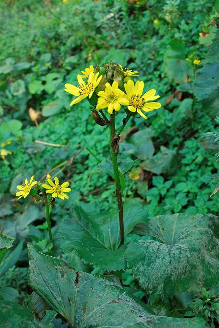 | 名は、葉がフキに似ていて、峠によく生えることからついたもの。別名エゾタカラコウという。 北海道と山形県月山以北の東北地方の低山帯~亜高山帯の水分の多く日当たりのよい草地に生える多年草で、高さ50-80cmになる。根茎は太い。花序以外は無毛。 根生葉はロゼット状で長さ30cmほどの長柄があって平開し、厚くつやがあり無毛。長さ5-13cm、幅8-25cmの腎円形で縁に不揃いの鈍い鋸歯があり、基部は心形で先は円い。葉柄の基部は広がって長い鞘になる。表面は緑色で裏面は淡緑色。苞葉は幅が広く、総苞と頭花柄の基部につく。 頭花は黄色で直径4-5cm、茎の上部に5-9個散房状に集まって咲く。頭花柄の基部に幅の広い苞葉がある。性の筒状花と雌性の舌状花からなる。筒状花は長さ1cmほど、先端は5裂して裂片は反り返る。舌状花は1列で7-12個あり、長さ2.5cm、幅5-8mm。頭花柄は長さ1-8cmでクモ毛と縮毛がある。総苞は長さ1.1-1.2cm、幅0.8-1cmの鐘形。 痩果は長さ6-7mm、冠毛は長さ1cmで僅かに赤みを帯びる。 よく似たマルバダケブキは、頭花が直径8cmと大きく、頭花柄の基部に苞葉がなくすっきりしていることで見分けることができる。カイタカラコウにも苞葉があるが、舌状花が5個程度、葉が鉾形で先がとがる。 花期:7-8月 分布:北・本(月山以北) 撮影: 2013.8.11 岩手県八幡平市 |