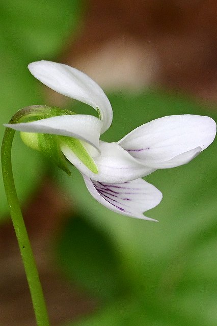 | 名は坪(庭の意)に生えるスミレの意。異説では花の形が墨汁(すみつぼ)の墨芯(すみさし)に似ているところから壺墨入の意とも。葉の形、または花柄を含めた花姿が高僧の持つ仏具である如意に似ているので別名ニョイスミレという(牧野富太郎の命名)。 平地の道端や田のあぜから山地の林床や草原まで、肥沃で湿ったところに広く群生する軟弱な多年草で、短い根茎がある。地上茎のあるスミレで、茎は無毛で根元から枝を分けて斜上し、高さ5-25cmになる。 葉は根生するか茎につき、根生葉は少ないが花期にあって鈍頭。茎葉は長さ1.5-3cm、幅2-3.5cmと横幅のほうが長い偏心形~3角状心形で縁に波状の低い鋸歯があり、先はとがり基部は広く湾入する。ふつう無毛だが、まばらに毛のあるものや裏面が紫色を帯びるものがある。托葉は長さ0.7-2cmの披針形で全縁または浅く切れ込む。 花柄は茎葉の葉腋につき、花は白色でごく小さく、花弁は長さ0.8-1cmで上弁や側弁は横に広がり、唇弁はほかの花弁より短くて紫色の筋が目立つ。花を前から見ると上下に押し潰されて横に伸びた形に見える。上弁と側弁の基部に突起毛がある。距は長さ2-3mmと短くて円く、白色~淡緑色。柱頭はカマキリの頭に似て横に膨らむ。萼片は広披針形、付属体は円形で短い。花期はほかのスミレより遅れる。 果実は楕円形で無毛の蒴果で裂開して種子を飛ばす。エライオソームは小さい。 花後に葉の基部の湾入部が極めて広くなり、半月~三日月状(ブーメラン状)になるものをアギスミレというが、変化は連続的でどこから区別するか迷うものが多い。ヒメアギスミレはアギスミレよりやや小型で茎が匍匐するものをいい、近畿地方以西~九州に産する。 花弁全体が淡紅紫色を帯び、唇弁が特に濃色のものをムラサキコマノツメという.。全体に小さい高山型で、花が淡紫色を帯び、地上茎が匍匐して途中から発根するものをミヤマツボスミレという。屋久島の高山に生えるコケスミレは、葉の幅3-7mm、花弁は長さ4-5mmと著しく矮小化したもの。 花期:4-6月 分布:北・本・四・九(屋久島まで) 撮影: 2004.5.30 岩手県北上市 |