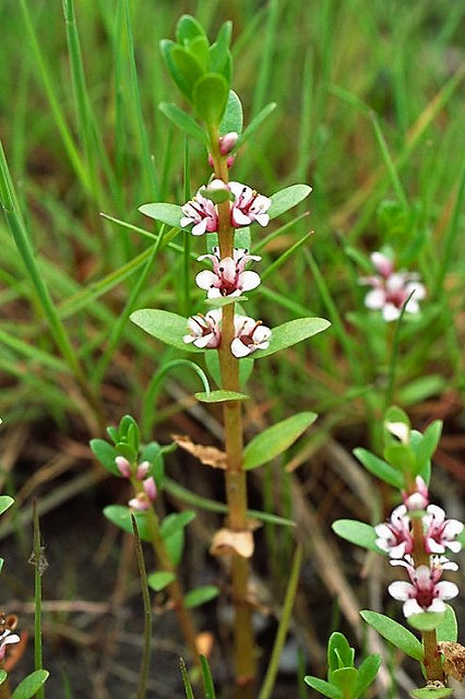 | 名は、海岸で群生して茂る緑の葉の様子からついたもの。別名シオマツバという。以前は独立したウミミドリ属であったが、現在はオカトラノオ属に含められている。 満潮時には潮をかぶるような岩礁や塩性湿地に生え、茎は円柱形で下部は地をはって上部は直立し高さ5-20cmになる多年草。全体無毛で僅かに粉白を帯び、茎や葉を傷つけると白い乳液が出る。横にはう太い根茎で殖える。 葉は無柄で対生するがまれに3個が輪生し、長さ0.6-1.5cm、幅3-6mmの広披針形~倒卵状長楕円形で肉質、表面は濃緑色で光沢があり裏面はやや淡い緑色、直立した茎に密につく。 葉腋に直径6-7mmで白色~淡紅色の花を1個つける。花柄はほとんどない。花弁のように見えるのは萼裂片で花弁はない。萼は広鐘形で5裂し、裂片は長楕円形で先は鈍い。雄しべは5個で子房の基部につき、萼裂片と互生する。葯は心形でその背部に糸状の花糸がつく。 果実は直径3-4mmの球形の蒴果で、下半部は萼に被われ、縦に5裂する。種子は腹面が突出してへそがあり、背面は平らで網目模様がある褐色の薄い種皮に包まれる。 花期:6-8月 分布:北・本(中部地方以北) 撮影: 2003.6.7 青森県六ヶ所村 |